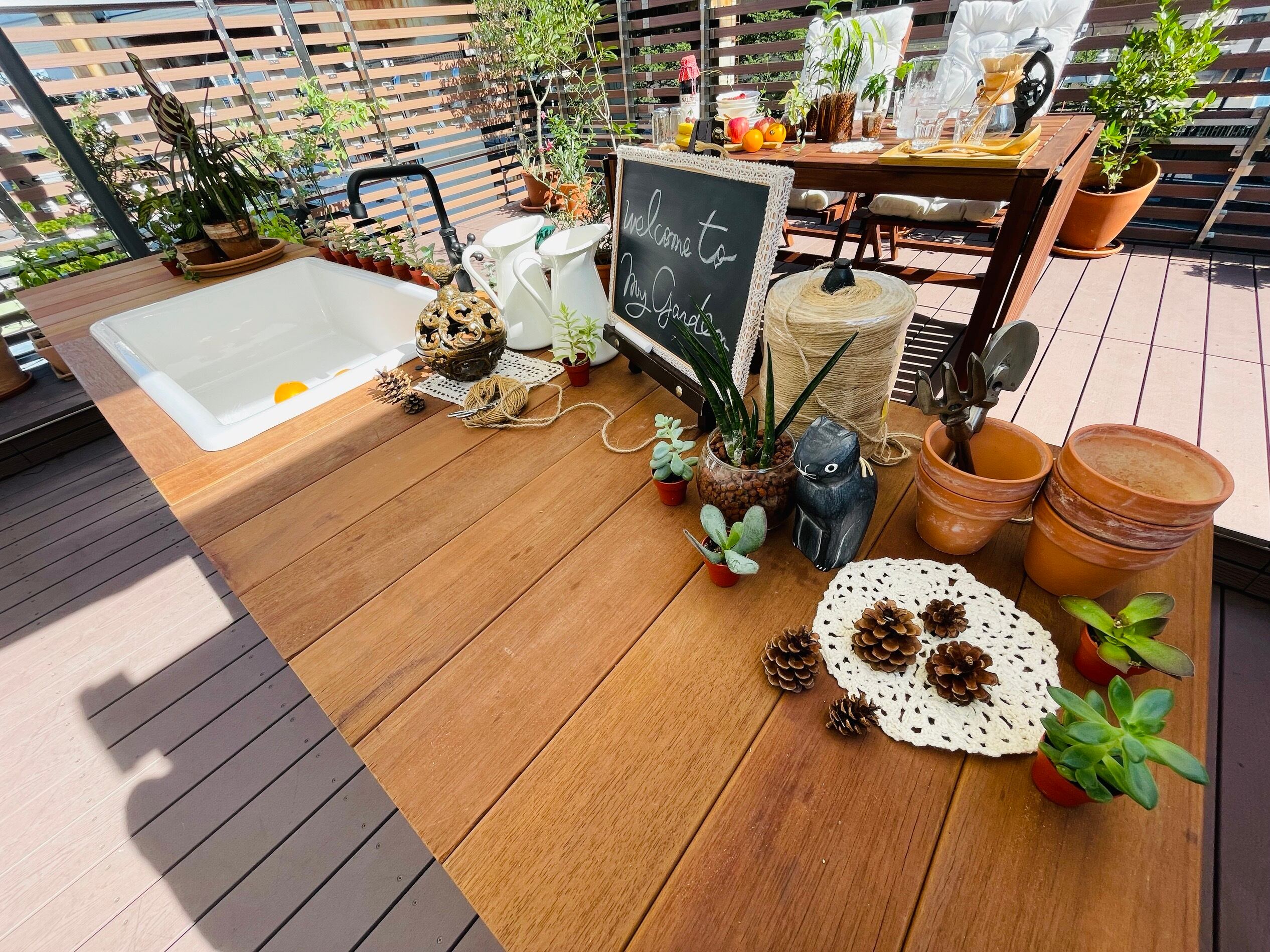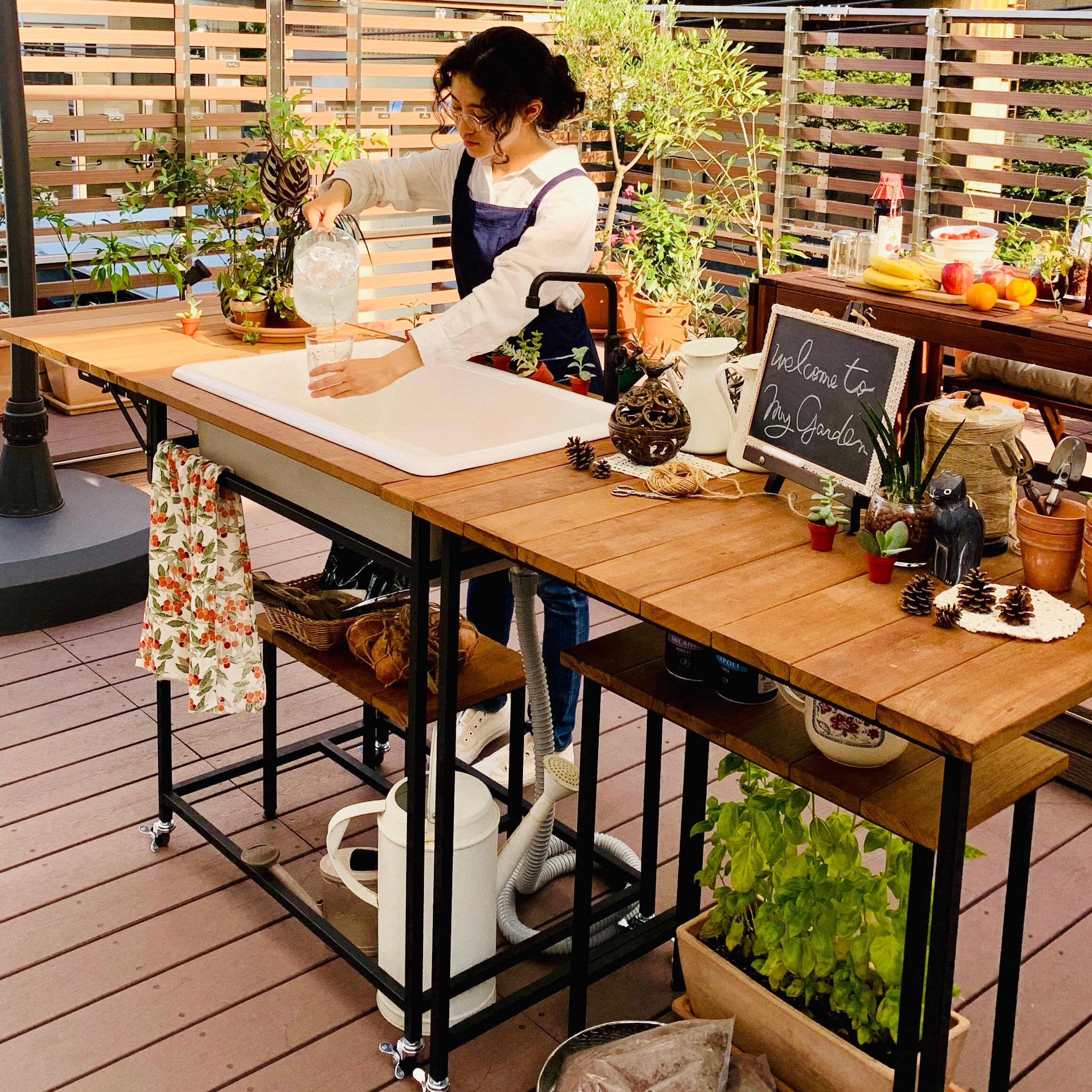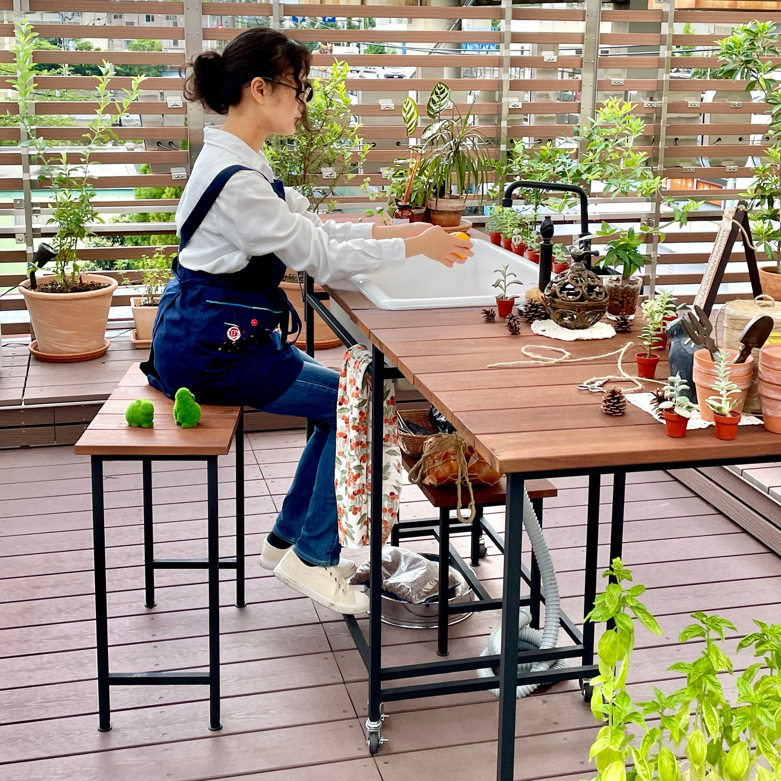 同シリーズのガーデンシンクと高さ・奥行きを揃えてあるので、隣に並べて作業台としてのご使用が可能です。充分なスペースが確保でき、シンクの使い勝手もさらにアップ!釣った魚をさばいたり、家庭菜園の野菜を調理したり。かがんですることの多いガーデニングの植え替えや寄せ植えも、腰を伸ばして楽に作業できます。